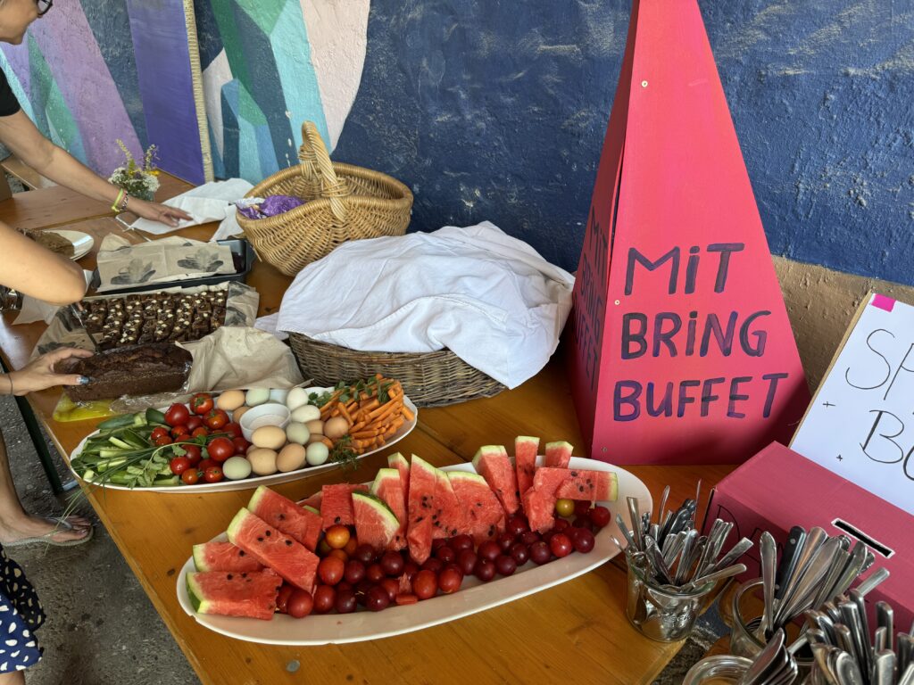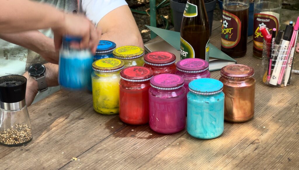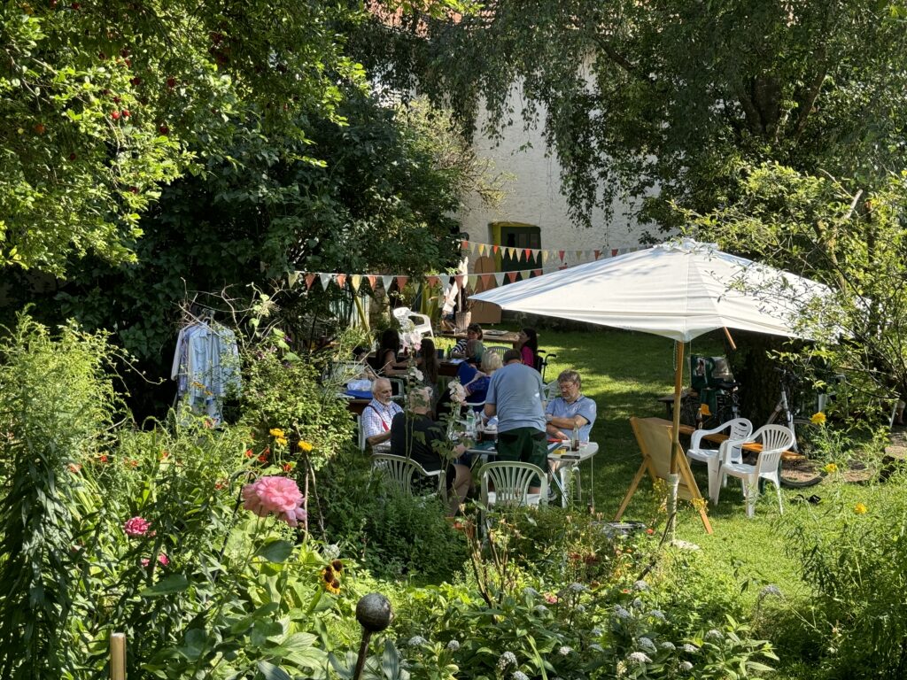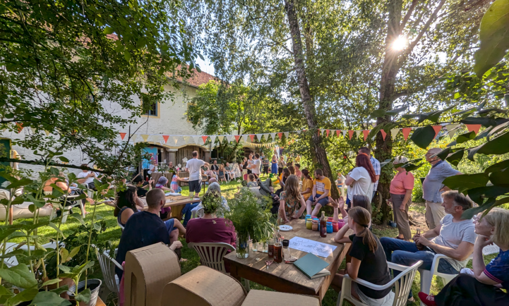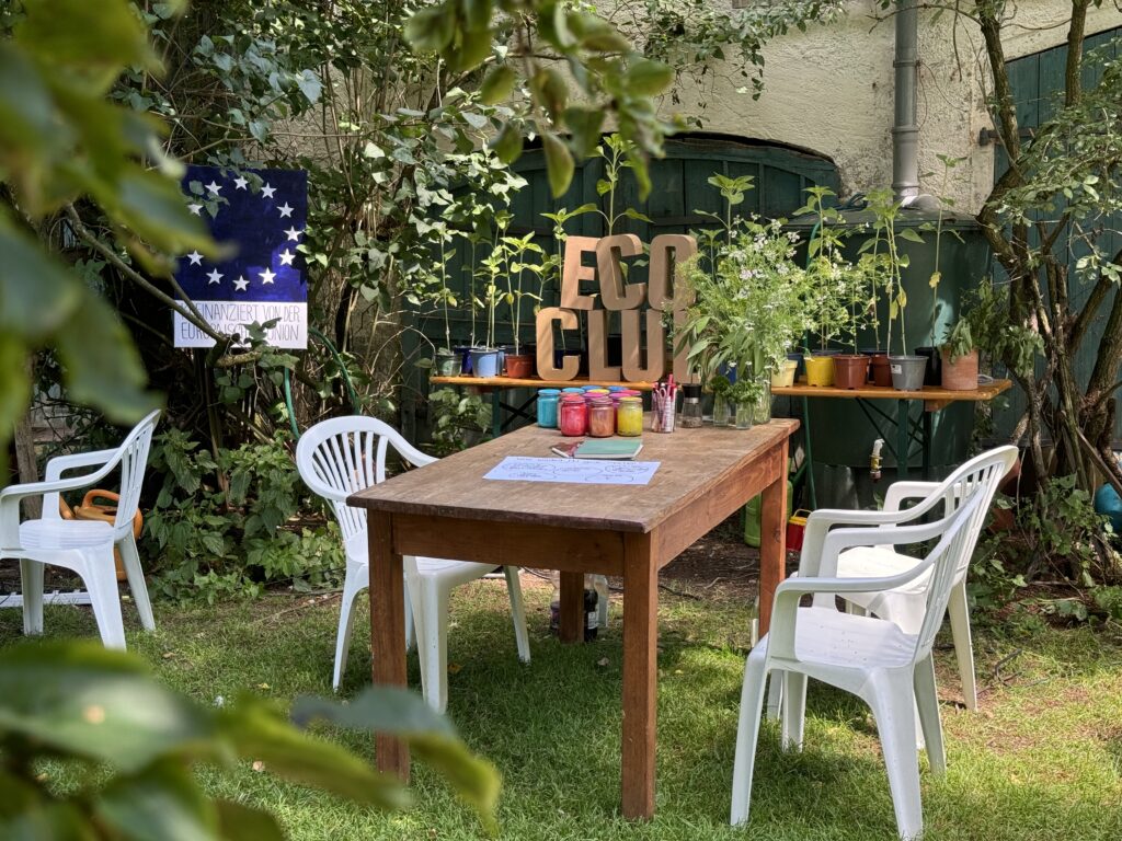 In 2024, to introduce Eco Club Projects to our wider Bavarian community, we collaborated with local artists. Their farm festival provided the perfect setting for an Eco Club program. We organized a variety of sustainable activities that appealed to different guests and interests, including a Repair Café with individual sewing sessions, a scent-memory game, a small Future Cinema, and crafting sessions where participants built insect watering stations from sticks and shells.